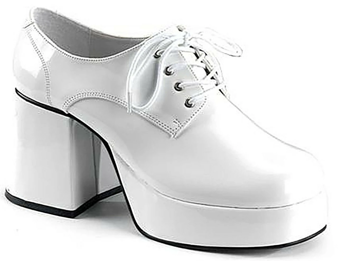 Jazz up and catch the Saturday Night Fever in these cool white Jazz shoes. These white patent polyurethane platform shoes will go perfectly with flared pants and cool disco shirts. It can even match with pimp clothing that can be a hit in any costume party.