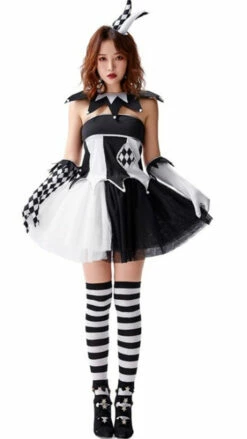 Make space for the best jester in town! Tonight, you will amuse the crowd and everyone will remember you. Show us all of your tricks. You’ll be looking extra cute in this black and white outfit, with a fluffy pettiskirt and uneven gloves.