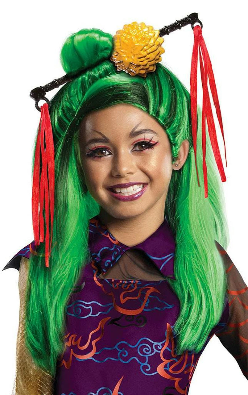 Complete your look for with this stunning Child Wig. Featuring long green hair with black highlights, and a bun in back, it also includes the black rod with gold ornament. This wig completes the look of Monster High Jinafire, an asian costume, a dragon costume or a ninja costume.