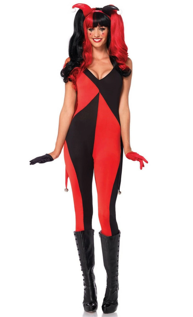 Be a fabulous star of the royal court in a stunning black and red spandex catsuit with bell draped shoulders. A matching horn headpiece complements a sexy deceiving look! Top off this costume with a fun 2 color wig to finish the look.
