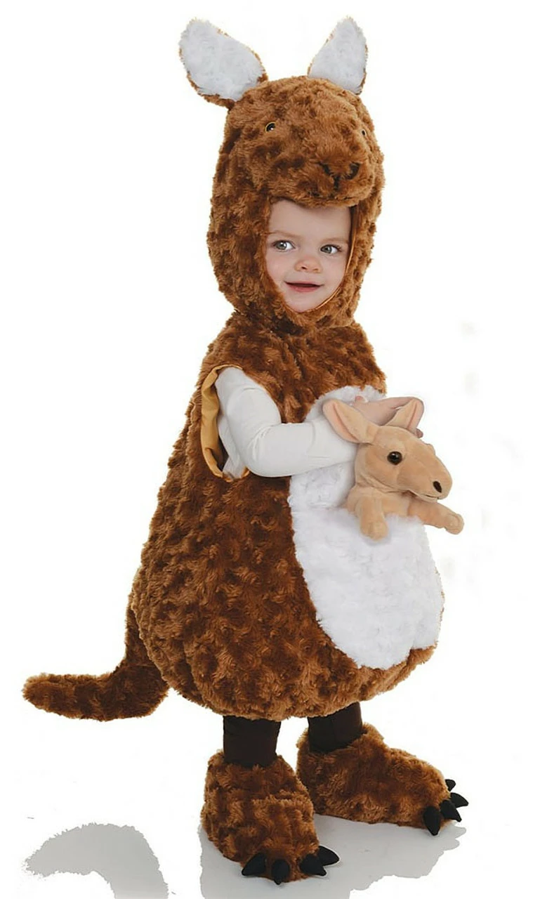 Does your little one love hopping around the house all day long? If so, get this Kangaroo Toddler Costume to make his day more exciting! This adorable ensemble features a brown jumpsuit covered with soft plush swirl fur, which is specifically made to look like a real marsupial. The body of this costume is shaped like a gumdrop with arm and leg holes, as well as a heavenly white front panel with pocket. It also has a tail that is attached at the back that looks so very cute, and a pair of shoe covers with claws. Of course, the highlight of this Kangaroo Toddler Costume is the included hood with a cute kangaroo face and ears, and the included stuffed baby animal. It’s definitely a great party wear!