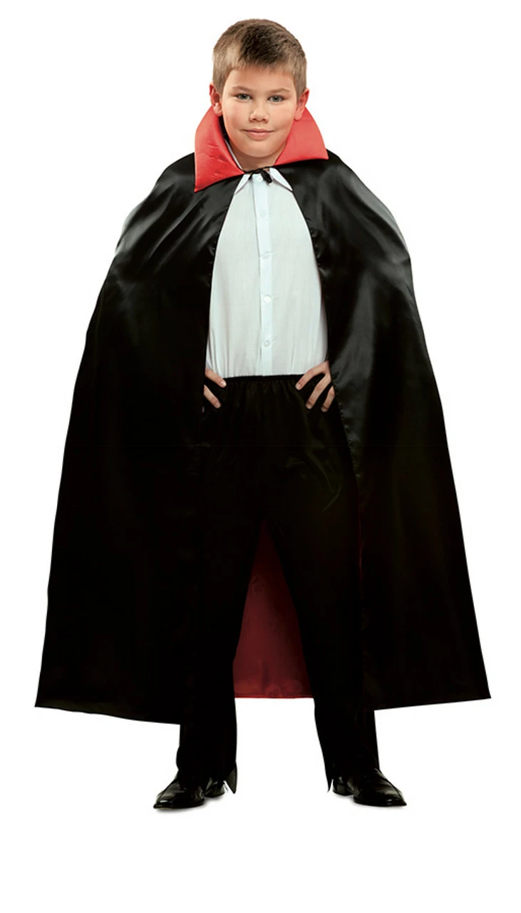 Coming up with a scary costume idea won’t be difficult this year with the Kid’s Vampire Cape – 1 Size. The costume is a great simple costume but also a great addition to any vampire costume this Halloween! It features a traditional black vampire cape with a big collar and the inside is lined in red.