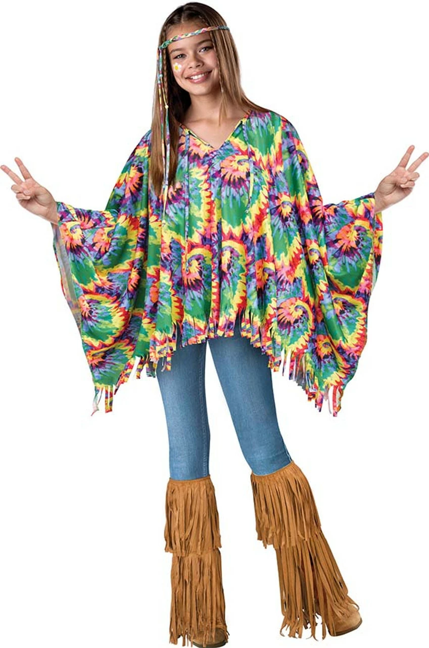 Does your little one need a simple costume for Halloween at school? This Kids HIppie Poncho and Head Tie is the best fast and easy costume idea! It features a tie dye printed poncho with a matching head tie.