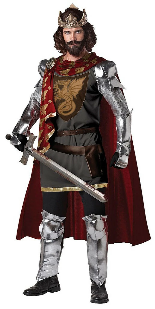 Become the fearless king with this superb King Arthur, a legendary leader and a great warrior. The King Arthur costume features a grey tunic with a dragon emblem, a splendid golden royal hemline and is accessorised with the crimson red velvet looking cape, bronze dragon medallion and leather double belt. The metallic finish gauntlets and leg guards complete the military air while the crown with faux gems complete the royal King looks.