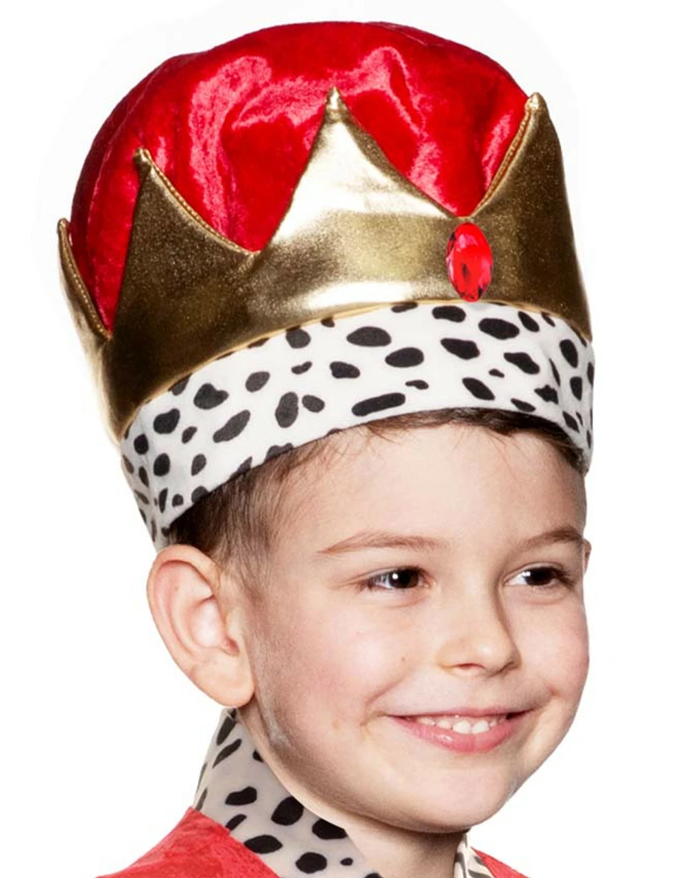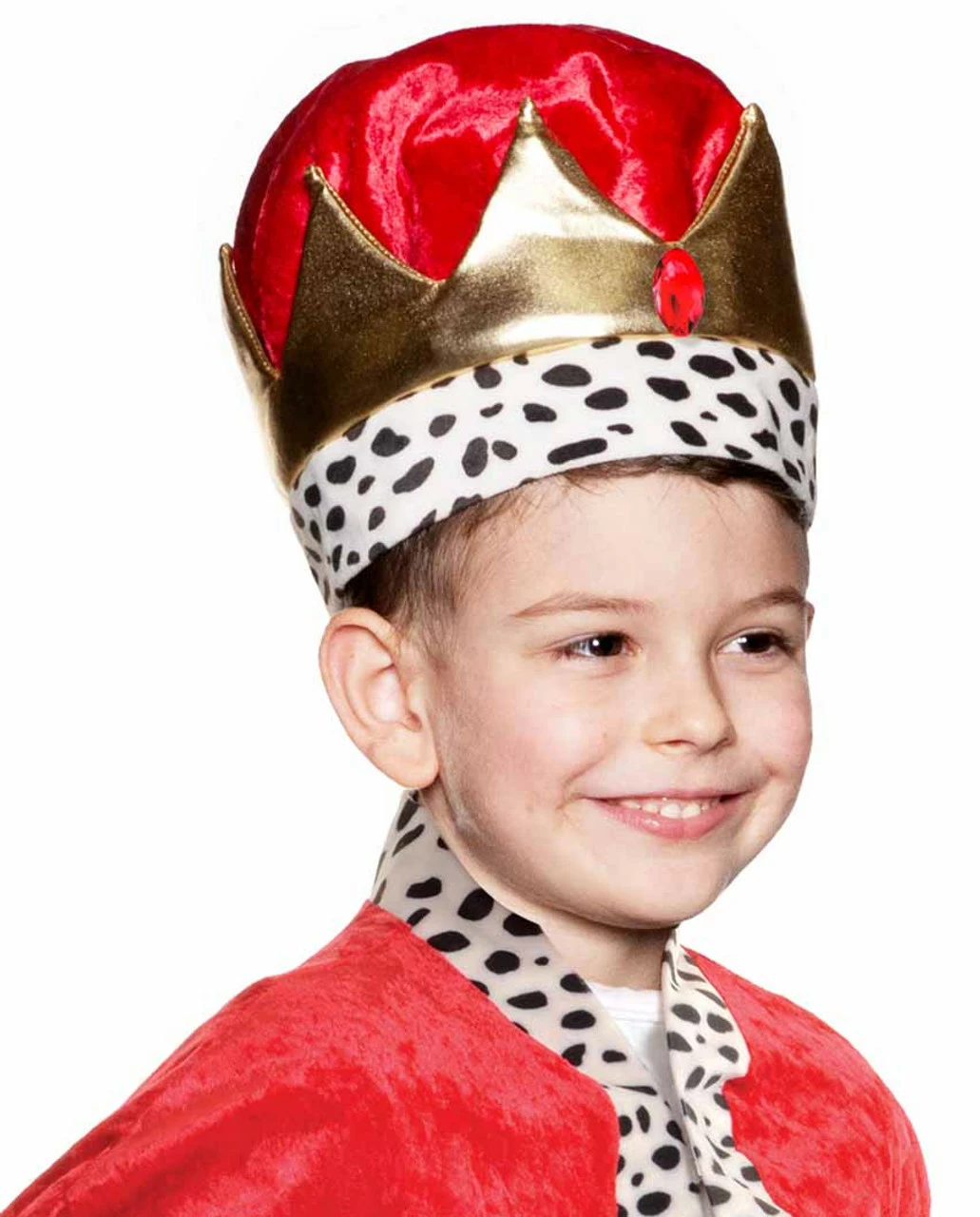 Be king for a day in this regal King Brown for Boys! This royal gold crown features bright red velour at the top and a bright red gem on the front, as well as a white and black spotted band around the forehead.