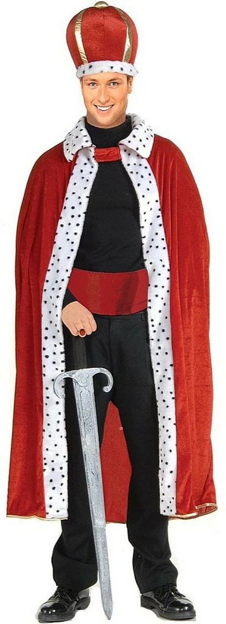 Be royalty for a day with this King Robe and Crown Adult set. This costume set includes a red cape with white and black fur trim and collar. It also comes with a red domed crown with gold accent. to the King be the glory!