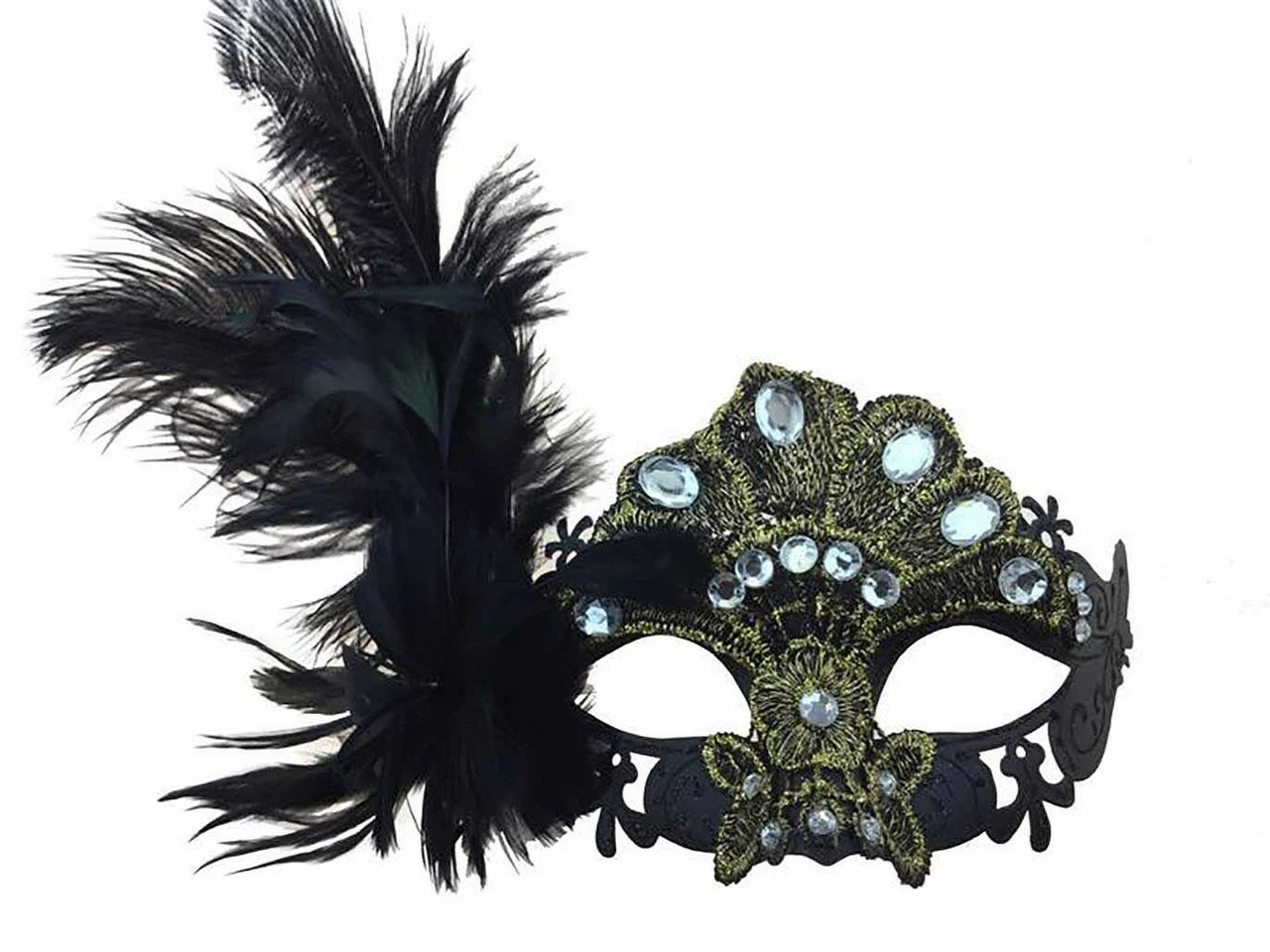 The Lace Rhinestone Mask Ostrich Feather on side – Black includes: