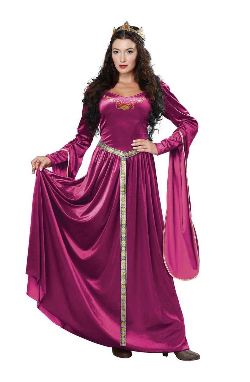 Perfect for Medieval festivals or Merlin fans, this authentic Lady Guinevere costume has it all! The gorgeous magenta gown features a swirling satin skirt, long flowing sleeves, and gold brocade belt and piping. A bejeweled half-crown completes the regal look. Look out, King Arthur and Sir Lancelot!