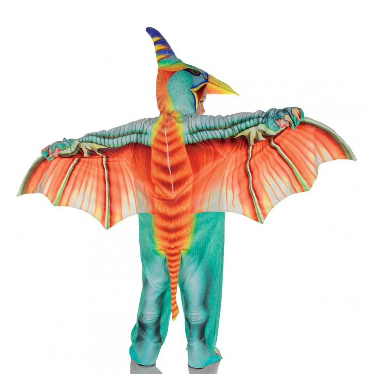 Your little one will soar through the skies in this cool Light Blue Pterodactyl Toddler Costume! It features a beautiful fully printed (front and back) pterodactyl jumpsuit, with orange fabric wings and an orange tail, attached shoe covers and mitts with printed claws, and a stunning printed pterodactyl hood.