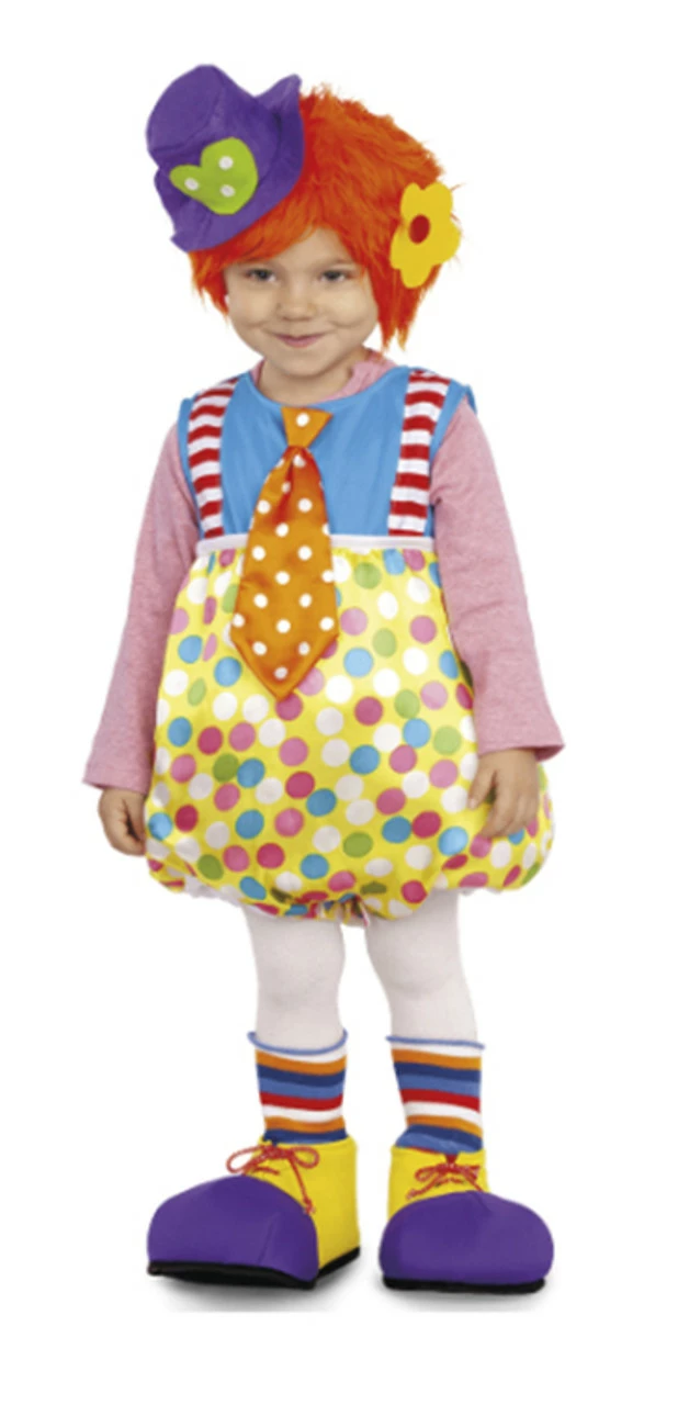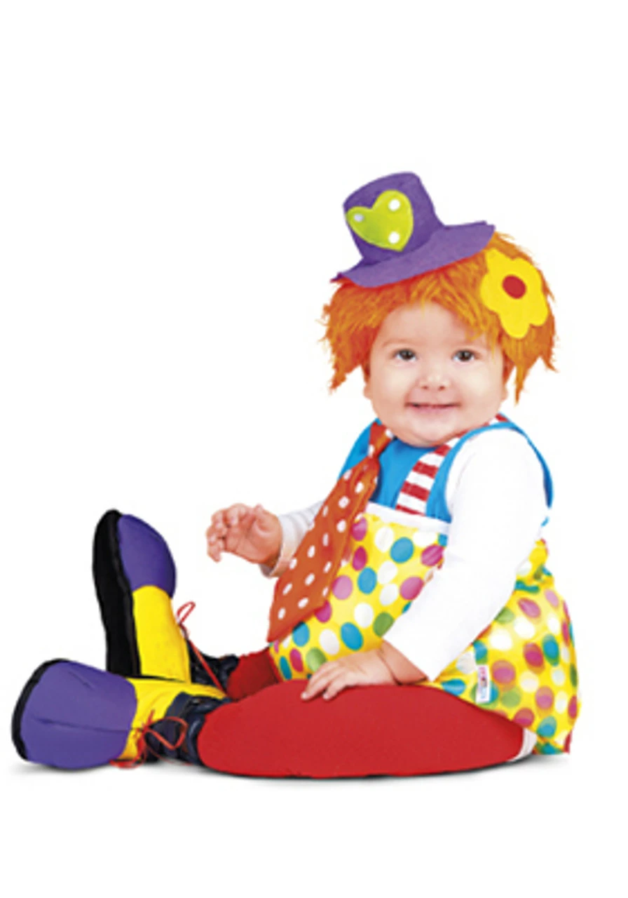 Let your little one share their funniest tricks this Halloween and make everyone at the party giggle in joy with this Little Clown Toddler Costume. This costume features a Dress with red and white striped straps over blue fabric with a polka dot orange tie. The rest of the dress is yellow with multicolored polka dots. This costume also comes with a headband with attached orange wig and purple hat with green details. The big yellow and purple clown boots complete the look!