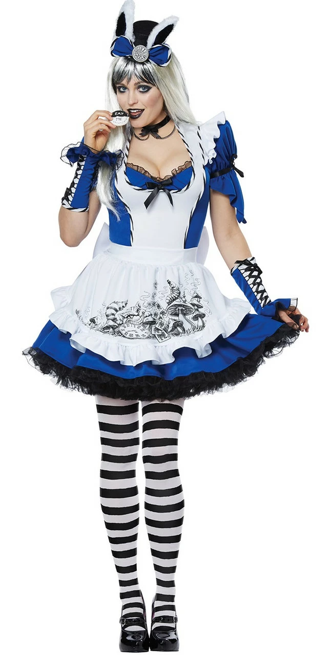 Watch out for this dark and mysterious version of Alice in the Mad Alice Women Costume. This is an edgier Alice in Wonderland costume that features a dark blue and black style dress with puff short sleeves, sweetheart neckline and a black ruffle trim. The attached white apron has the Cheshire cat and other whimsical designs on the front and a black and white trippy trim. The matching blue and black hat with detachable bunny ears and bow headband complete the look with matching gloves and chocker! If you have tried a traditional Alice costume in light blue before, why not try this darker version of Alice.