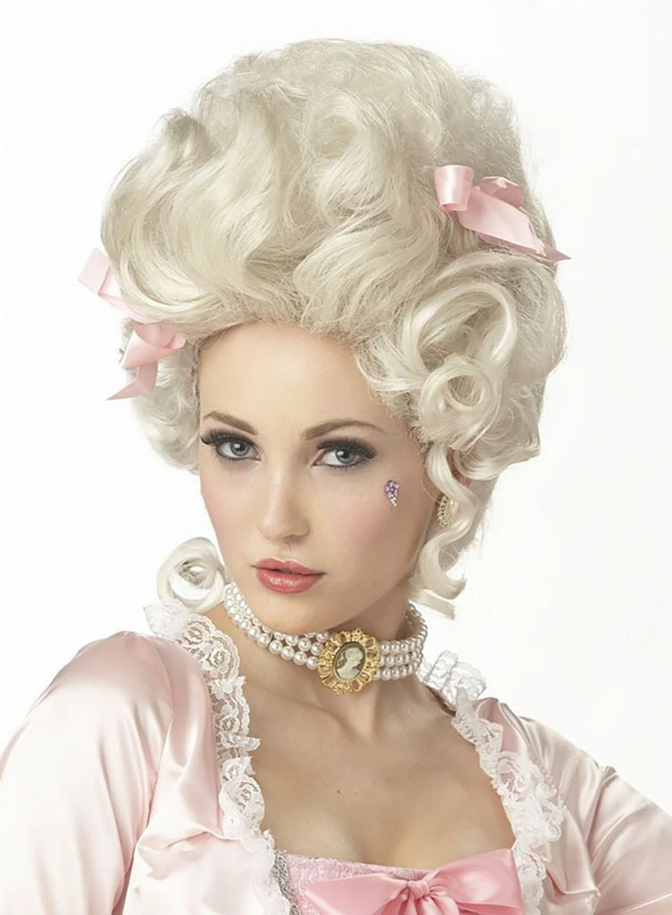 This elegant Marie Antoinette Blonde wig is great for any ball gown ensemble. This fun and flirty costume wig is great for masquerade parties or any costume parties. It features the Updo buffante hairstyle with Pink Bows accent