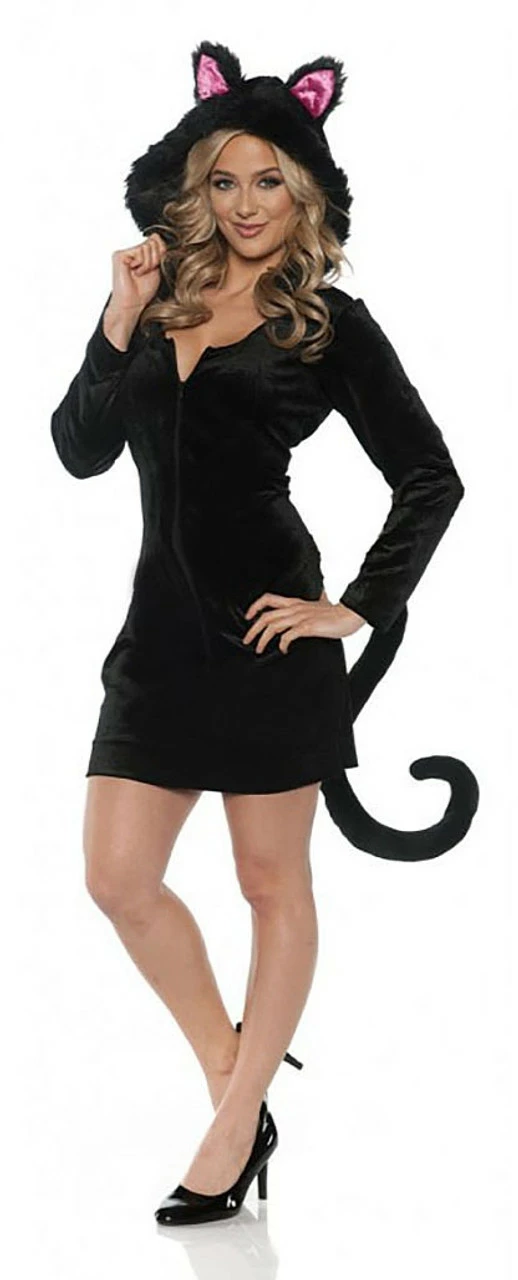 Dress up as an attractive black cat with this Black Cat Mini Dress costume! All eyes will be on you when you wear this costume featuring a hooded, form fitting, black mini dress with a zip front and an attached tail. The hood features a black faux fur trim and soft cat ears.