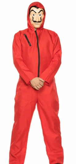Incarnate a character from your favourite TV show in this Casa de Papel inspired Money Heist Red Man Costume! It features a bright red jumpsuit with a front zipper and a hood. The look is completed with the Dali Mask.