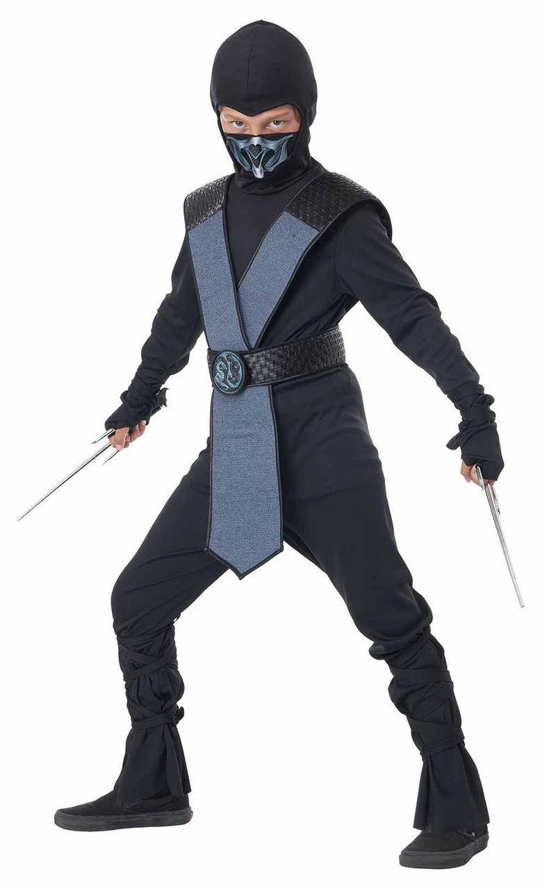 Let your child show off their incredible martial arts skills and fight off evil in this Dragon Master Blue Ninja Kids Costume! This outfit features a black hooded top, with matching black pants, a face mask with a golden pattern for complete secrecy! This costume wouldn’t be complete without this beautiful leather like belt with chest straps and tabard, leg and arm ties and a medallion. Don’t forget to add ninja weapons to complete this wonderfully fierce and agile costume!