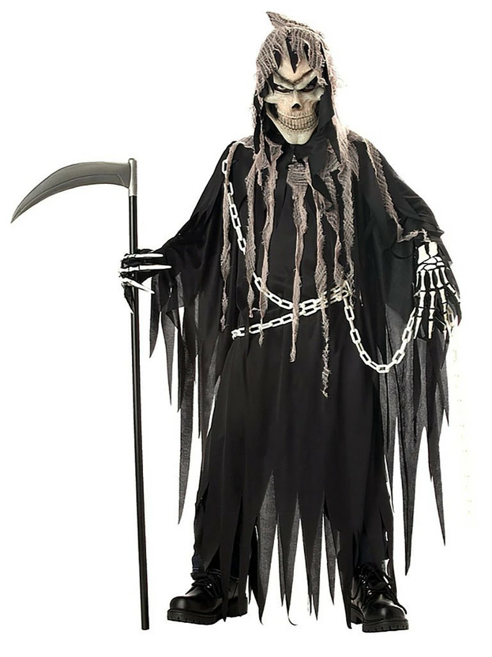 Have a horrific and grim Halloween with the Mr. Grim Child Costume with its tattered robe and hood, glow in the dark mask, glow in the dark hands and glow in the dark chain. This eerily glowing costume is perfect for kids going after tricks or treats. Let your little one have fun in the Mr. Grim Costume which features the:
