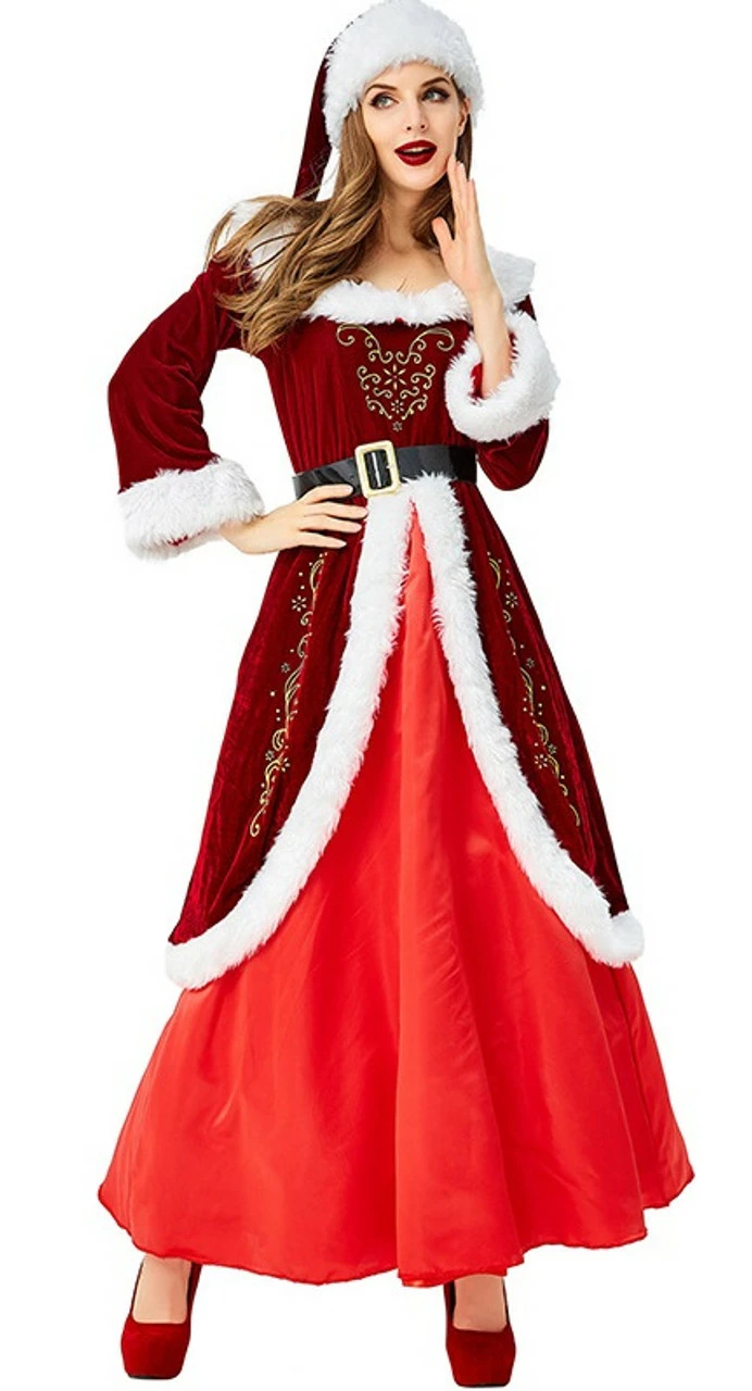 Dress up as a truly classic character and look just like Mrs. Claus! The Mrs. Santa women’s costume Features a two layer dress with two shades of red and a faux fur white trim with gold detailing and a hat just like Santa Claus!
