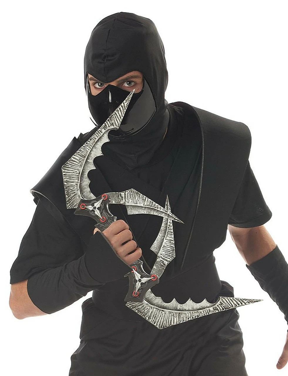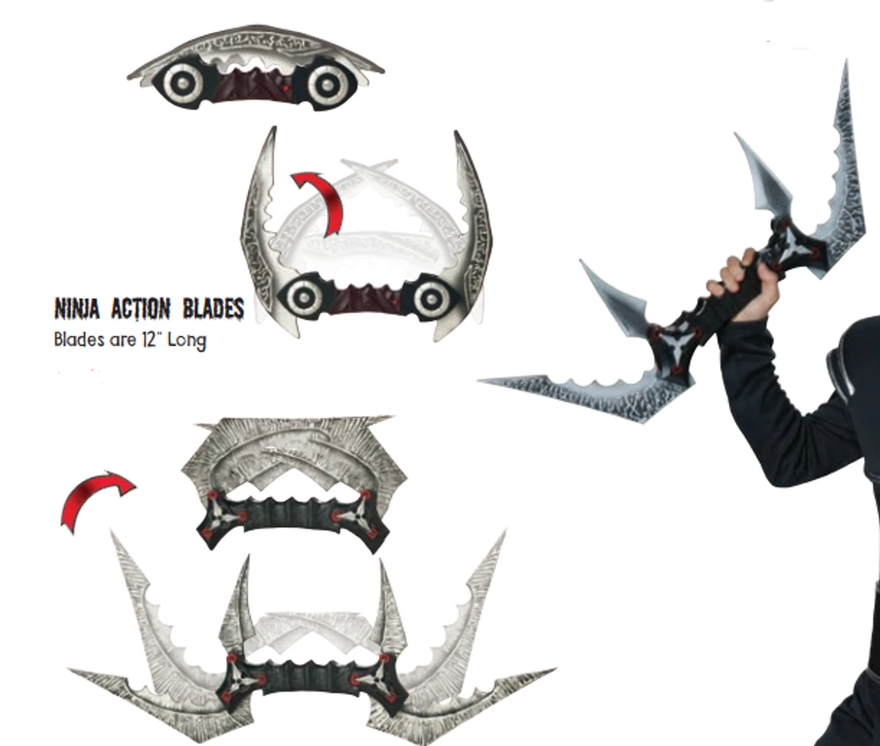 The Ninja Assassin Blades are the perfect weapon accessory for your Ninja Costume with its black handle that opens and closes the silver soft blades for a powerful effect. The balde is 10 inch long that extend to 30 inch when it is open.