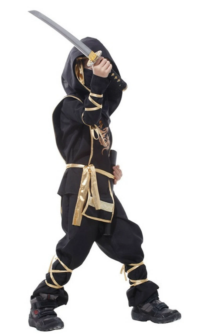 Does your little one dream of being a ninja? The Ninja Black and Gold Kids Costume is perfect for them. This beautifully made deluxe costume features a black top with an attached hood, a golden string belt and a gold dragon design on the front. The black mask, pants and golden wraps for the arms and legs complete the look! A premium costume that will not dissapoint.