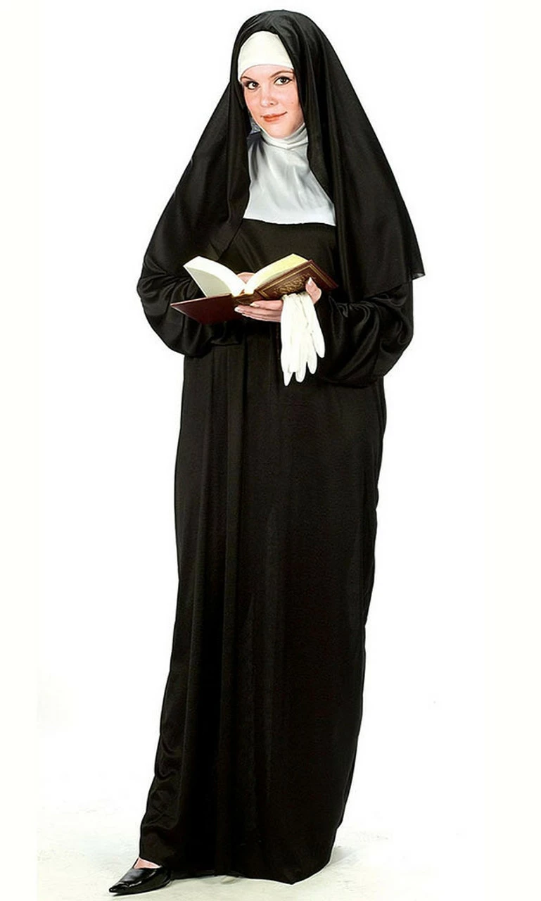 Grab your Bible and cast out demons in this Nun Adult Plus Costume! This ensemble features a nun-style black robe with long sleeves and a white hood. It also features a black veil with white trimmings, a coordinating collar and a pair of matching white gloves for a complete character look. With this outfit, you can have your partner dress up as a priest to have a sinful evening.