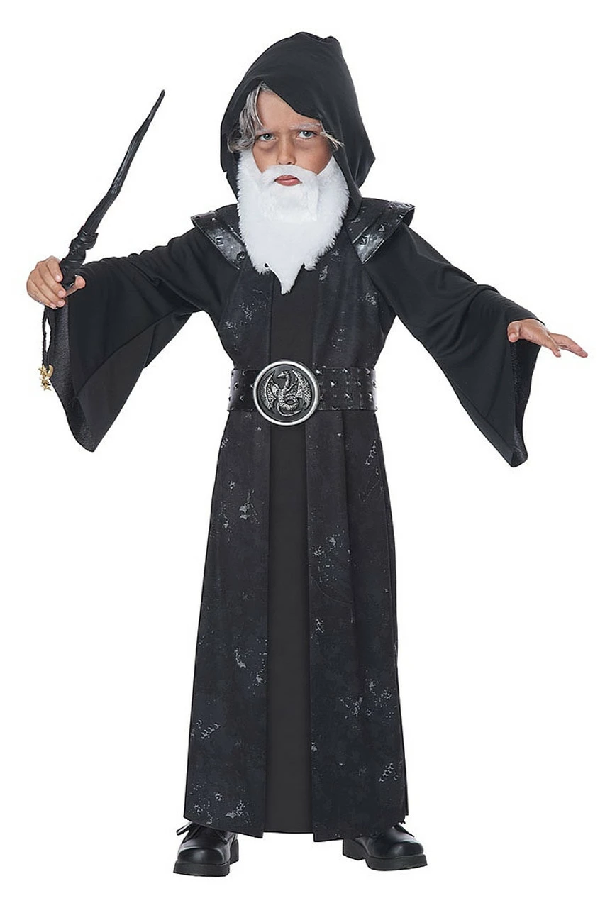 Cast spells and get all the Halloween candy with your magic powers in this Old Wizard Toddler Costume! It features a long black robe with an attached hood, a studded belt with a dragon buckle, and a white beard.