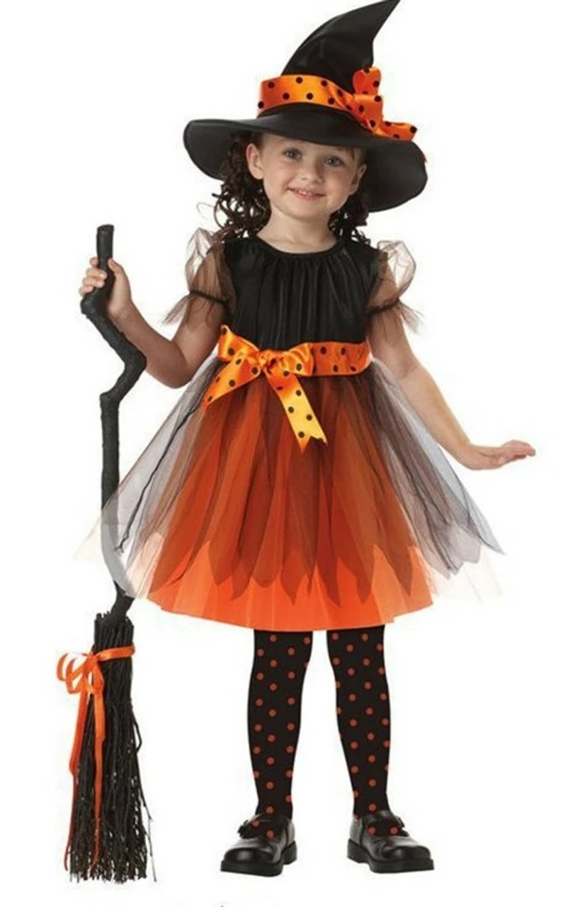 She’ll be the cutest witch! She might put a spell on you and ask for more candy! This costume features an orange and black dress with an orange ribbon and tulle fabric.