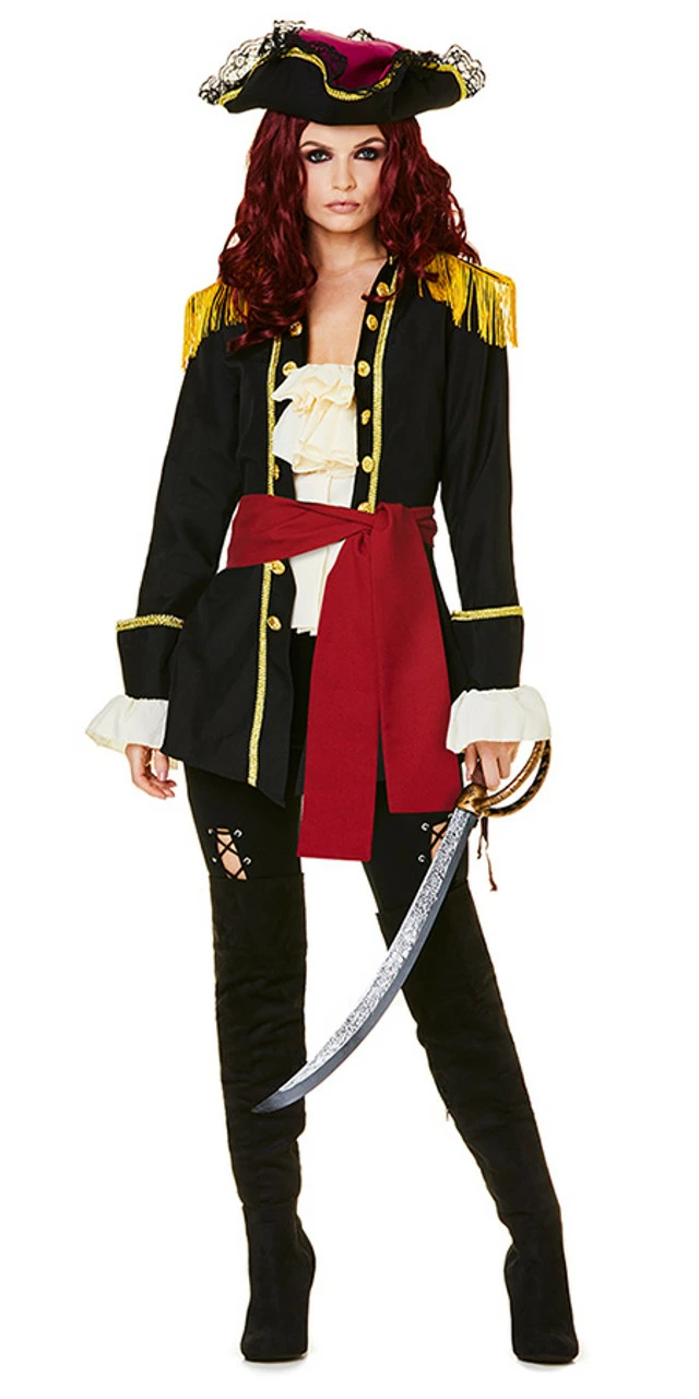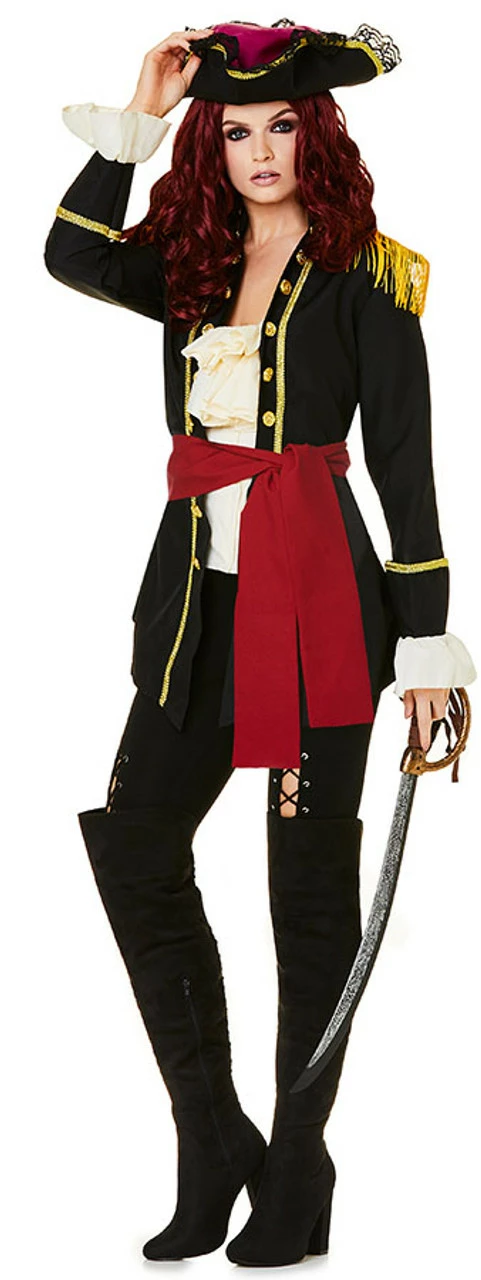 Be a classy shipmate in this Pirate Captain Women Costume. The costume feature a beautiful black jacket with gold trims and buttons, as well as epaulets with fringes on the shoulders. The jacket also has a white shirt insert in the front and ruffles on the sleeves. A a red sash and a beautiful black tricorn with gold and lace trims complete the look that’s sure to add a dash of flirt to the festivities. Shiver me timbers!