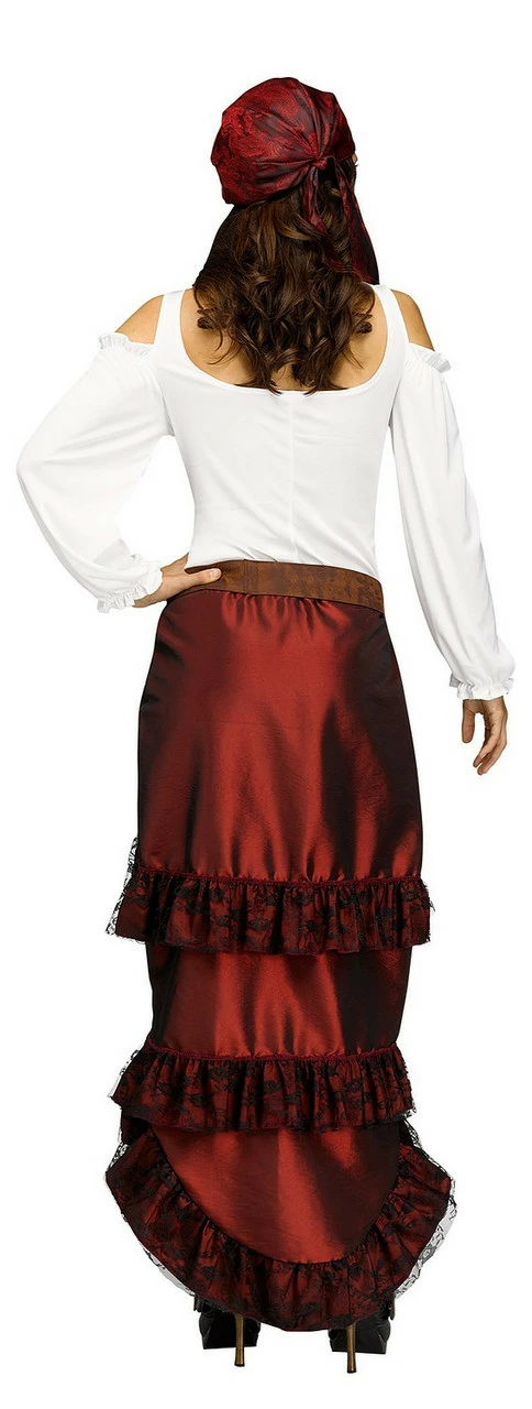 Transform yourself into a stunning pirate and rule over the seas with this beautiful Pirate Queen Adult costume! It features a dress with a white, off the shoulders top, a brown lace up bodice, a matching brown belt with a silver skull, and a red, ruffled high-low skirt, as well as a red pirate cap.