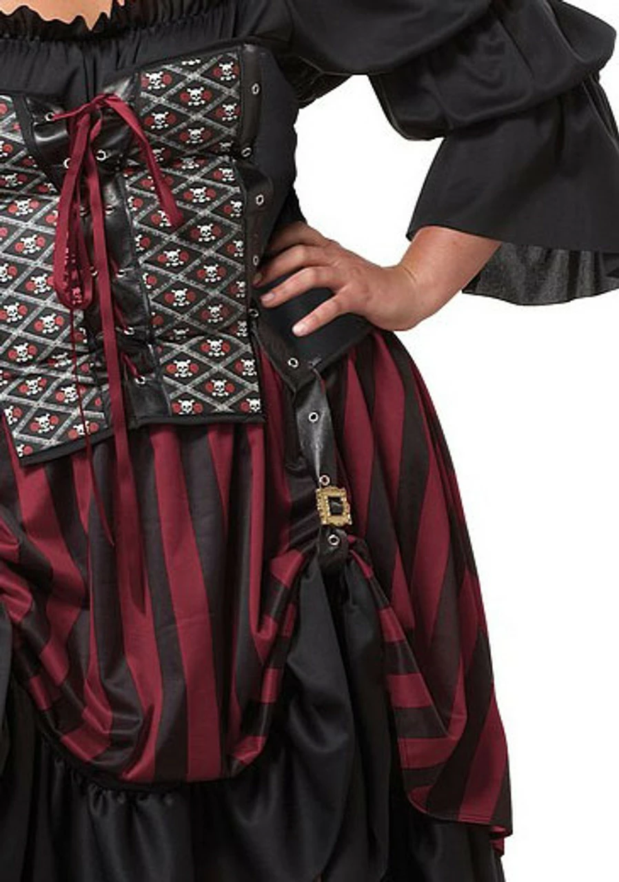 Dressing up like a lady pirate? Try out the alluring and playful Pirate Wench Plus Size Costume. Featuring black peasant off-the-shoulder long dress, three quarter length sleeves, corset style top, you will like the adjustable length skirt in black and a deep red. The matching headband is also included. This fun Pirate Wench Plus Size Costume is a sure head-turner that even the most dashing Pirates will find it hard to resist!