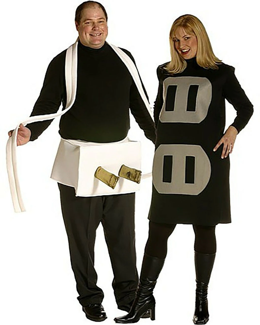 Want a couples costume that is fun and will be the talk of the town for years to come? If you and your partner are daring enough, this plug and socket costume set is just your schtick this halloween. The female gets the socket costume which is a black tunic with upper and lower sockets while the male gets the plug costume which is a white foam box that is worn on the waist with an open bottom for easier movement. The plug has a 10-feet long white foam cord which can be worn over the shoulder. How is this funny? The lower socket on the woman’s front hip actually has flap openings where the gold fabric prongs can fit into. This is funny for an adult party. If there are kids around, try not to elaborate too much about where the prong fits. * Includes black socket tunic and white foam plug * Shoes, shirts, pants, and leggins not included * Available in plus size for adults * Comes in black/gray/white design
