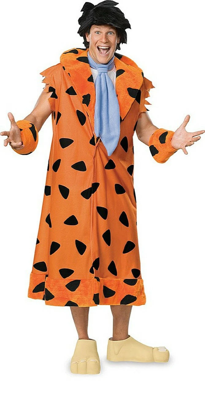 Here is Bedrock’s much loved caveman, Fred Flinstone. Wear this celebrated long, orange and black coat with faux fur collar and faux trim. It comes with a matching cuffs, a blue necktie and shoe covers that looks like you’re walking bare footed! Not to forget that this awesome costume comes with a black wig for that total Bedrock appearance!