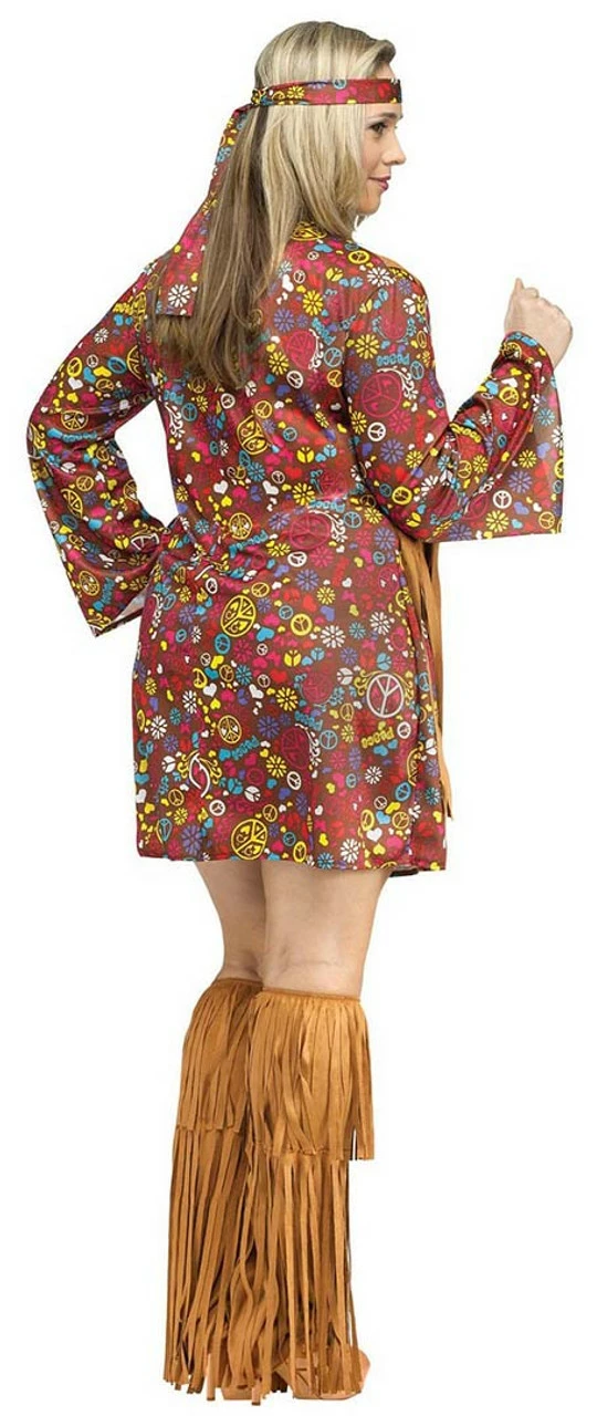 Take a step back in time and join an earlier generation, spreading peace and love with this Peace & Love Hippie Adult Costume! This lovely ensemble includes a flower-printed mini dress with an attached brown vest and long sleeves. It also features a matching flower-printed headband and fringed boot covers that complete the retro appeal of the outfit. And for additional touch of the hippie generation, this dress is enhanced with a bright peace sign print, flower accent and fringes. Wear this and you’ll sure have groovy fun this upcoming Halloween!