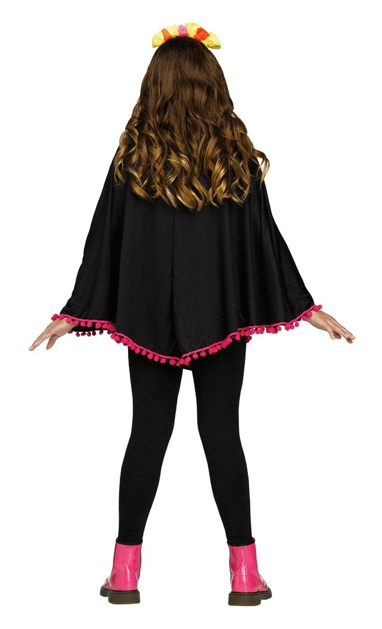 Transform yourself into a skeleton filled with flowers within seconds thanks to this cool Poncho Day of the Dead Girls Costume! It features a poncho with a pink hem and a white skeleton with flower prints.