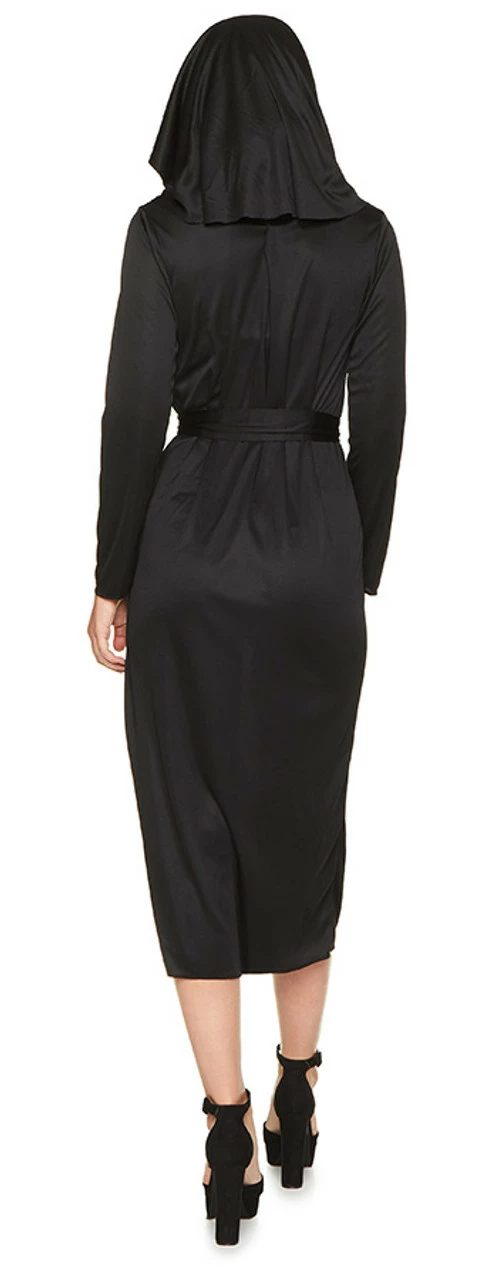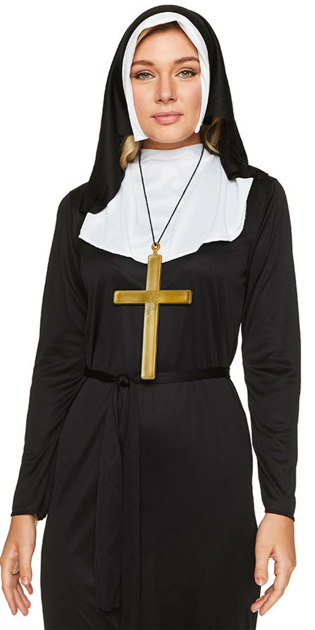 Look saintly and practice your best Hail Mary’s when you wearing this Pray for me Nun Women Costume! It features a black mid length dress with long sleeves with an attached white collar section. It also includes a black tie-on belt to bring the waist section in. The costume is complete with a black and white nun habit. You can now start your prayers!