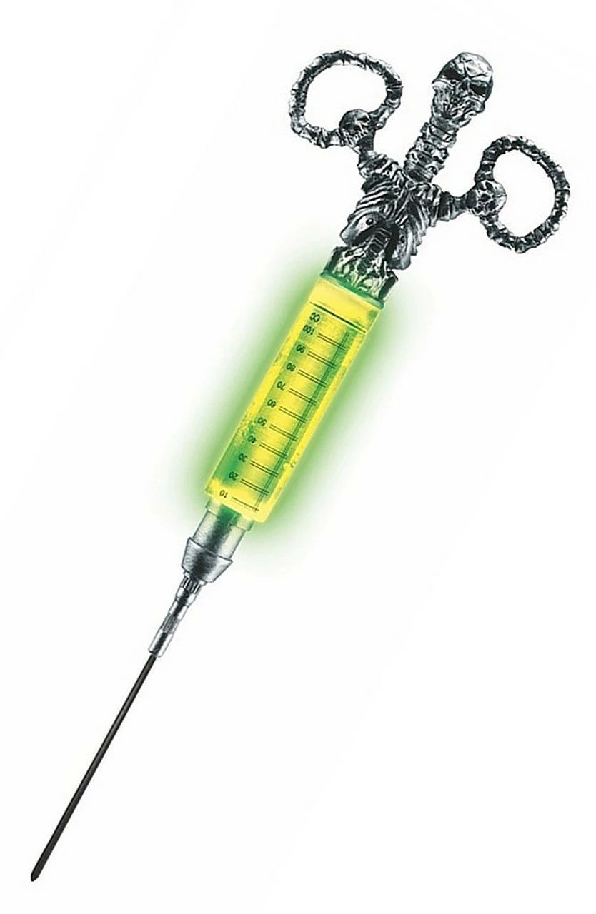 The Radioactive syringe is a 15″ lengh seringe that glows in the dark! Is a perfect accessory for your Demented Doctor Costume or any horror creature!