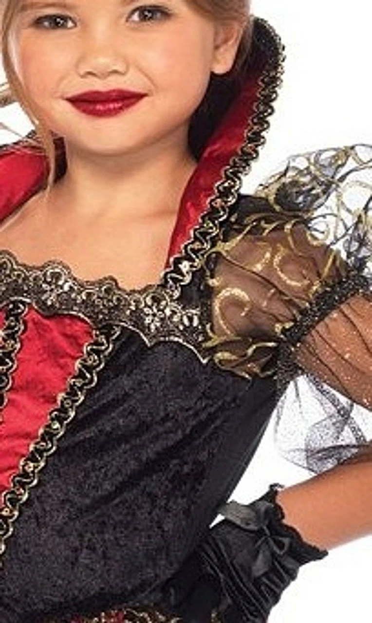 Become the Queen of Wonderland in this Deluxe Queen of Hearts Girl’s Costume! It features a full-length dress with glitter tulle accents along the waist and puffed sleeves. This black and red dress is stunningly detailed, with a gold braid trim and a high collar, as well as a long red skirt. It also comes with a pretty, sparkly black crown with a red accent!