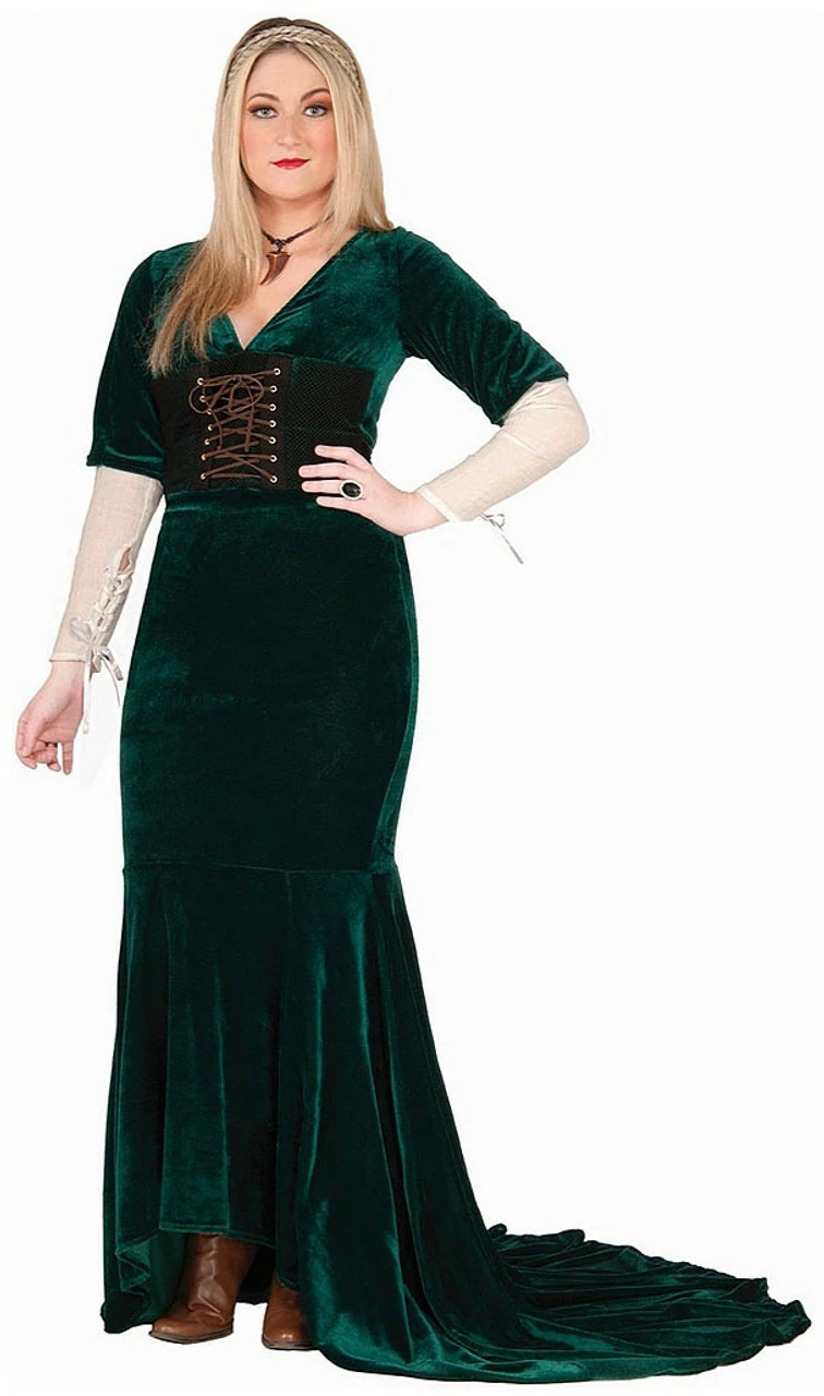 Get ready to travel back in time while showing your hidden curves with this Revealing Renaissance Plus Costume! This unique dress comes with a V-shape neckline and a front corset belt. It also features an attached sleeves and a long flowing skirt with train, which reveal more elegance and timeless grace. Wear this lovely costume with matching accesories and be ready to become the princess of the evening!