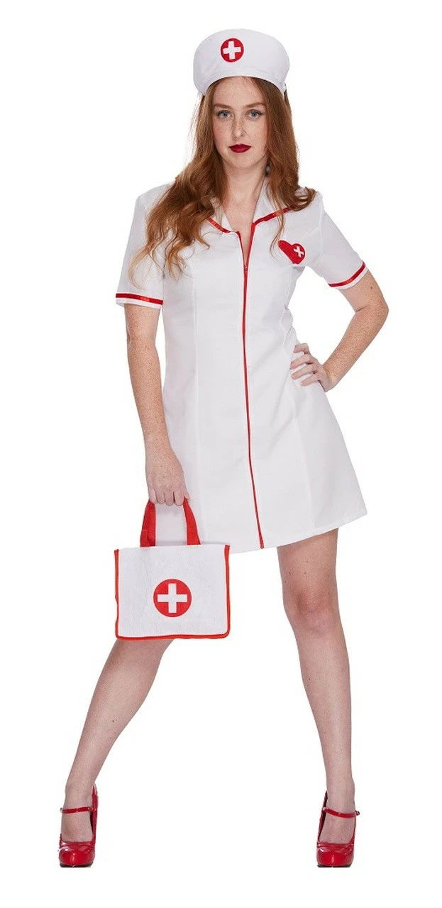 Take lives in this fabulous Lethal Nurse Women Costume! This costume, inspired by Cassie Thomas in A Promising Young Woman, features a short white dress with red trim and a white collar by the neckline. This form-fitting dress also features a zip enclosure by the front and a heart emblem on the chest for a truly heart-stopping outfit. This outfit also includes a multicolor pastel wig to wear with her nurse’s headpiece, as well as a white bag with cross on it for medical supplies.