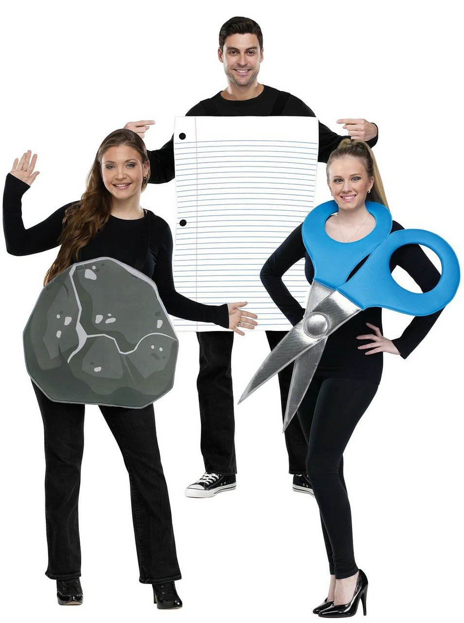 Looking for a perfect group costume to wear this Halloween? Hurry up and tell your friends that you’ve just found that best party group costume ever! Inspired by one of the most popular hand games of all time, this great set features three costumes in one bag! It includes one rock costume, one scissor costume, and one paper costume, which are all just perfect for a puzzly night. The best thing? This Rock, Paper, Scissor Costume is so quick and easy to wear, and you can even put it over any kind of garment!