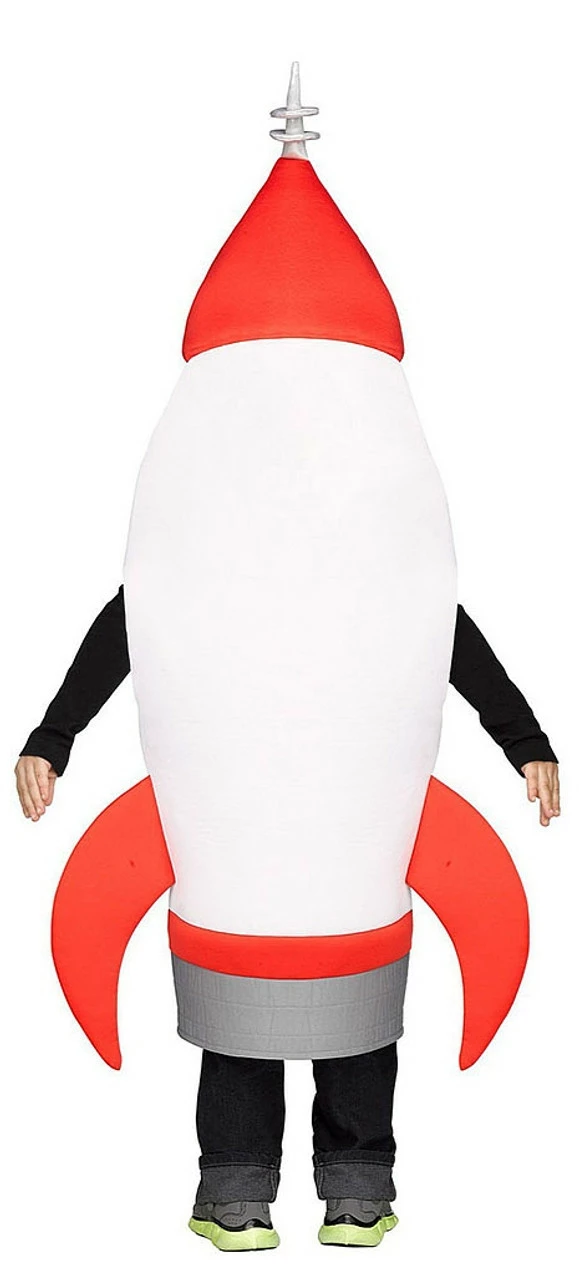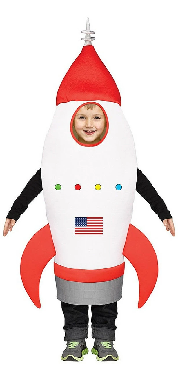 If your little boy dreams of being an astronaut, this Rocket Ship Toddler Costume will have him over the moon! It features a red, white, and grey rocket tunic with holes for the arms, a hole for the face, a red rocket nose, two red rocket fins, four decorative buttons, the American flag, and a red-and-grey bottom part.