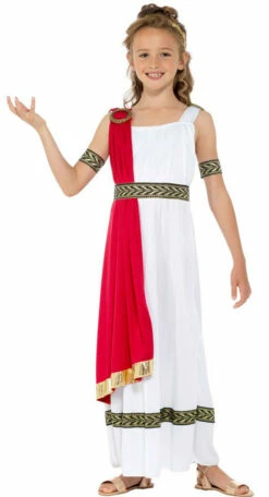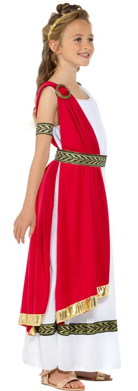 Become the empress of Rome and rule with an iron fist in this Roman Empress Girls Costume! Immerse yourself in rich history in this outfit consisting of a white dress with red shoulder sash and brown patterned belt to tie everything together. This outfit also includes matching arm cuffs and a head band, so you can travel back to ancient Rome in style.