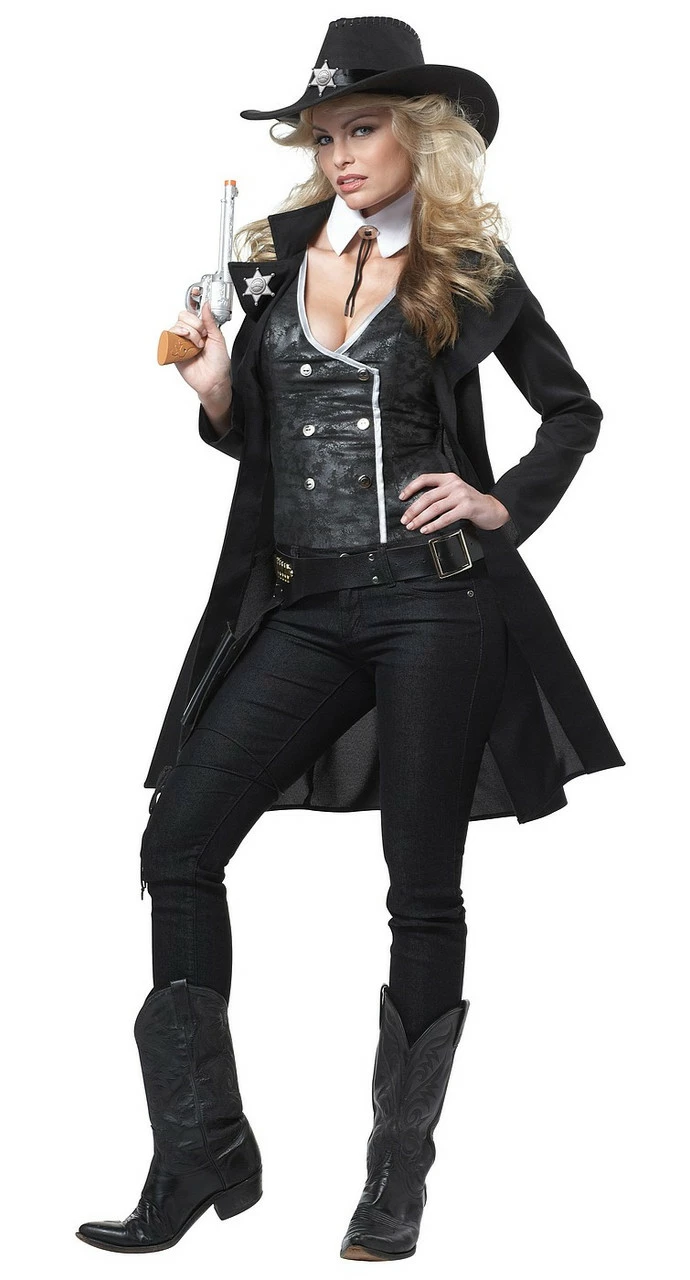 Girls can join the cowboy boys with this Round’Em Up Costume. The costume features black vest with silver trimming and silver buttons, black vest and the striking collar. The badge, holster belt even the black hat with badge is included. Complete the look with a gun and some attitude.