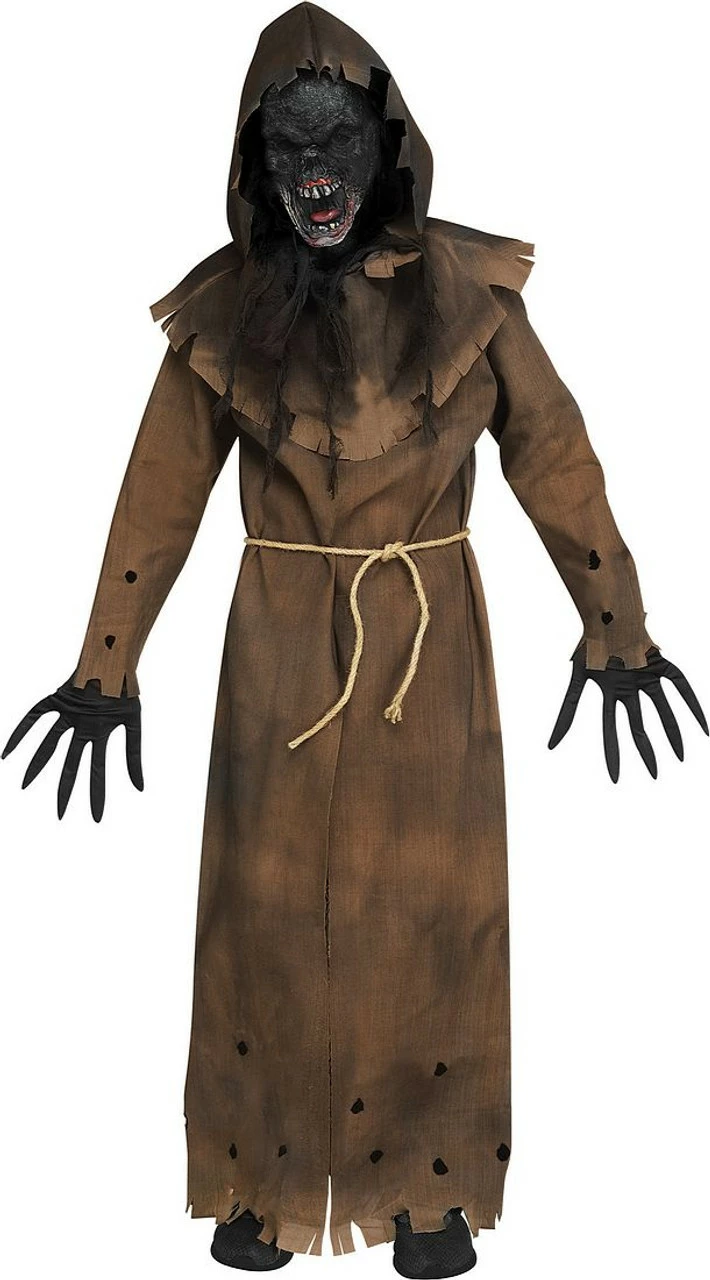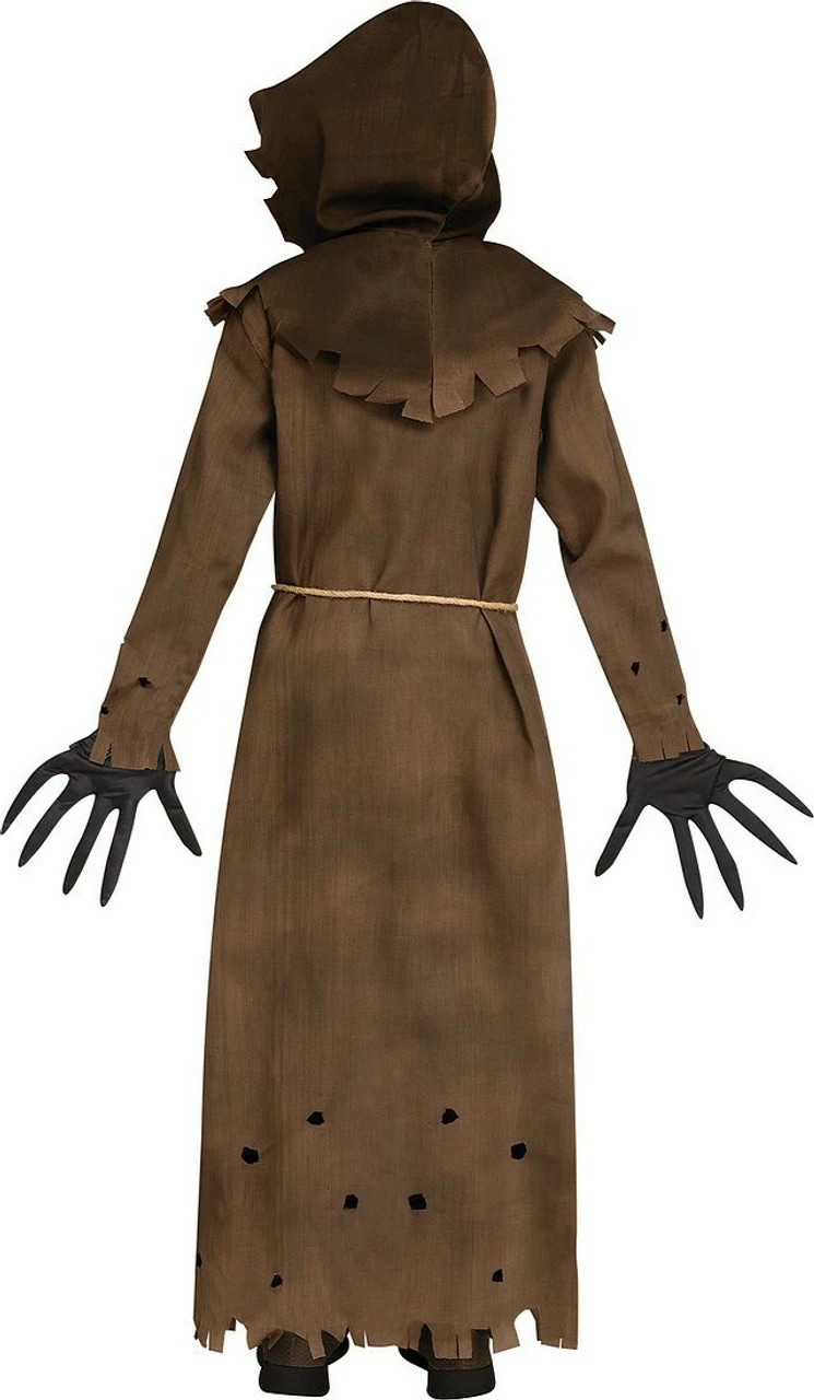 Does your child want to be something truly scary this Halloween? The Scary Catacomb Kreeper Kids Costume is the a great scary costume! It features a PVC mask with gauze, a distressed and tattered robe with a matching hood and collar. The rope belt and gloves with stuffed pointy fingers complete this creepy look! The PVC mask has gauze accents and a frightening smile