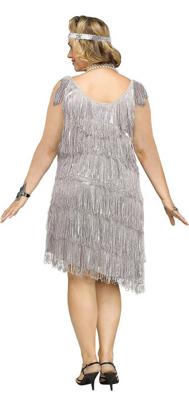 Relive the flapper years as you parade with this classic Flapper in silver tailored to fit in plus size. The costume features fringes all over that moves around as you move. The Flapper Costume is perfectly crowned with a shimmering headband.