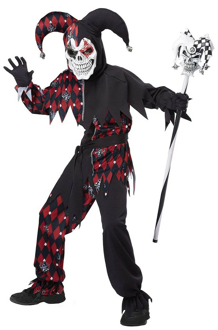 Is your child a trickster? Then they will feel incredibly comfortable in the Sinister Jester Child Costume. The alternating black and burgundy pattern, zig zag ends, waist belt and fiendish mask create the impression of someone who has a busy night ahead of them, making mischief throughout the neighborhood for all the trick-or-treaters. Complete the jester look with a staffer and few expressions!