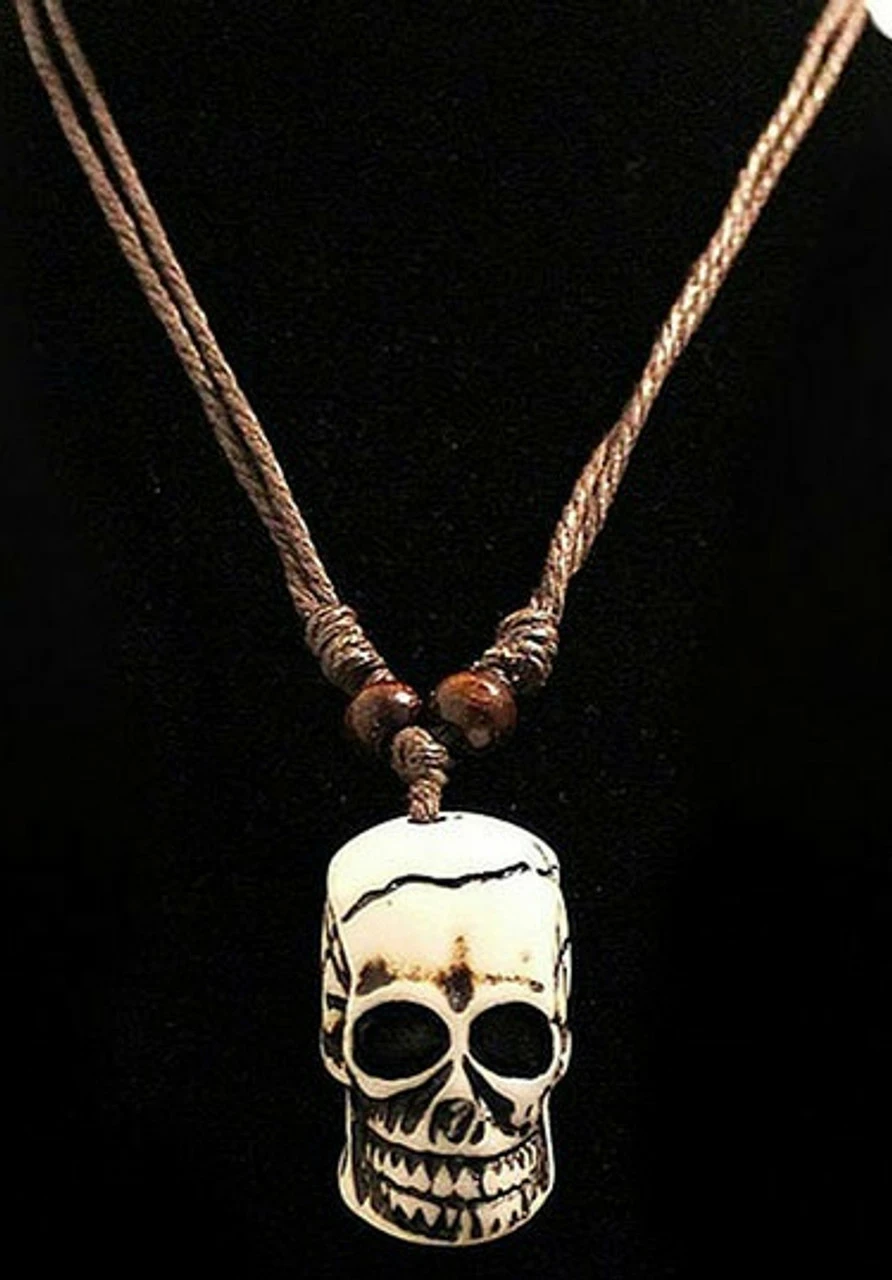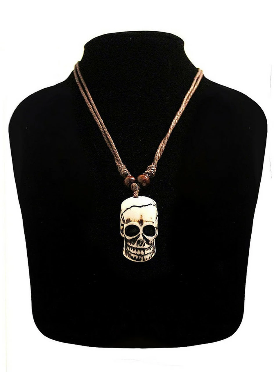 Need a Skeleton Necklace that is something more than the many others? Get this 3 dimensional white skull head necklace! The necklace comes with the skull head and an adjustable leather cord with wood beads near the skull.