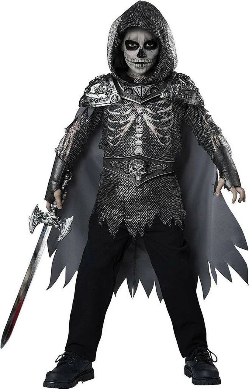 This spooky Skull Knight Boy Costume is sure to be a hit this Halloween. It features a skeleton-printed shirt, a black cape, a pair of black and silver molded shoulder pieces, a faux-chainmail tunic and a matching collar with a hood, as well as a pair of faux-leather gauntlets, and a belt.