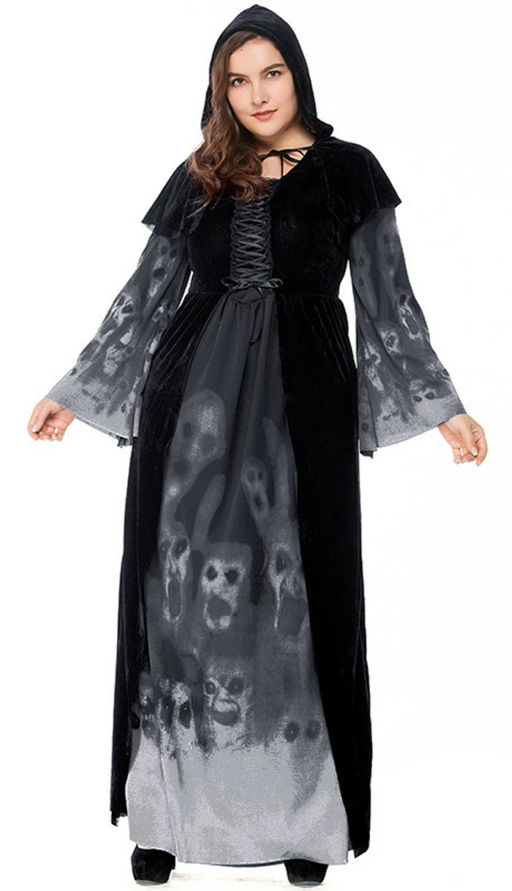 This Halloween, don’t wear the same boring ghost costume as everyone else! You will be scary and original in this Soul Seeker Woman Costume, which features a long faux-velour black dress with a laced-up black bodice, as well as long flared sleeves revealing wailing ghosts. The costume also includes a black hood.