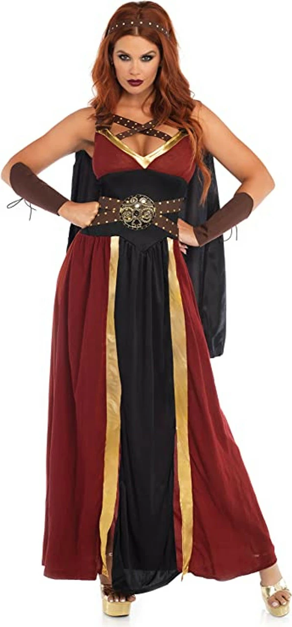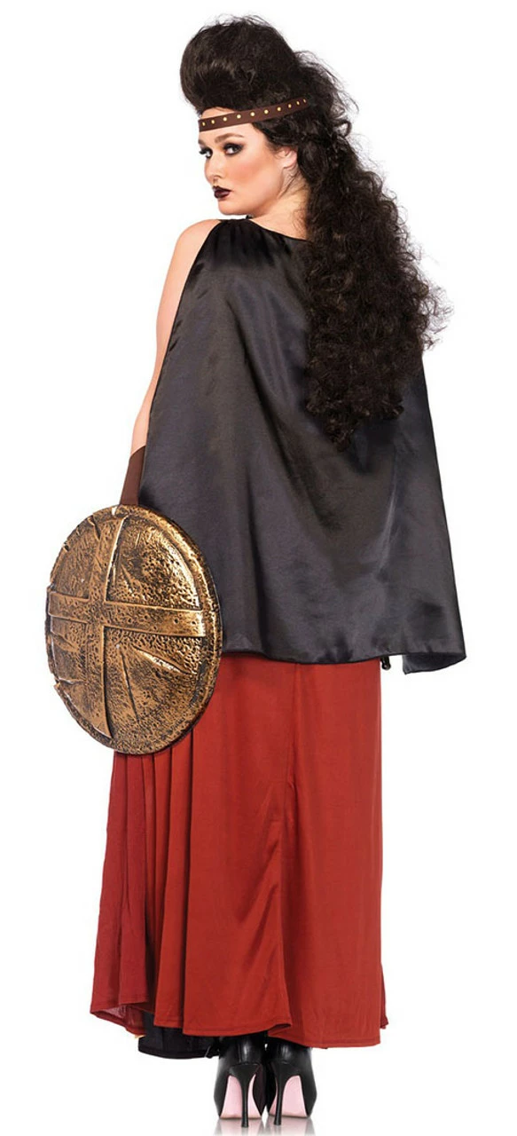 Regal Spartan warriors were matchless in their courage and war skills and their costumes often played a great role in that. The Regal Spartan Warrior Plus Size Costume features a long flowing dress with two front opening and gold trimmings. The faux leather straps and buckle, and the wrist protectors complete the warrior look. A stunning costume!
