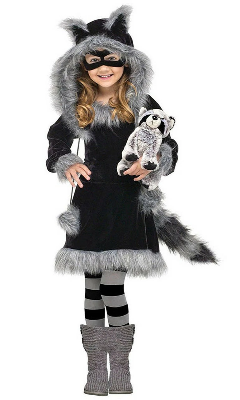 Your little one will sure look adorably sweet when you get her this Sweet Racoon Toddler Costume! This pretty ensemble features a black velvet dress with a plush raccoon tail, a lovely character hood and faux fur trim on the sleeves, neckline and hem. The hood features a comfortable face opening, a pair of furry raccoon ears and a plush pompom accent. This Sweet Racoon Toddler Costume also includes a matching eye mask and striped black and grey tights for an additional appeal. A perfect wear for Halloween, the outfit itself is made with soft and comfortable material, which insulates your daughter’s sensitive body against cold weather. So bring this home and let your daughter have a fun night with this great party wear!
